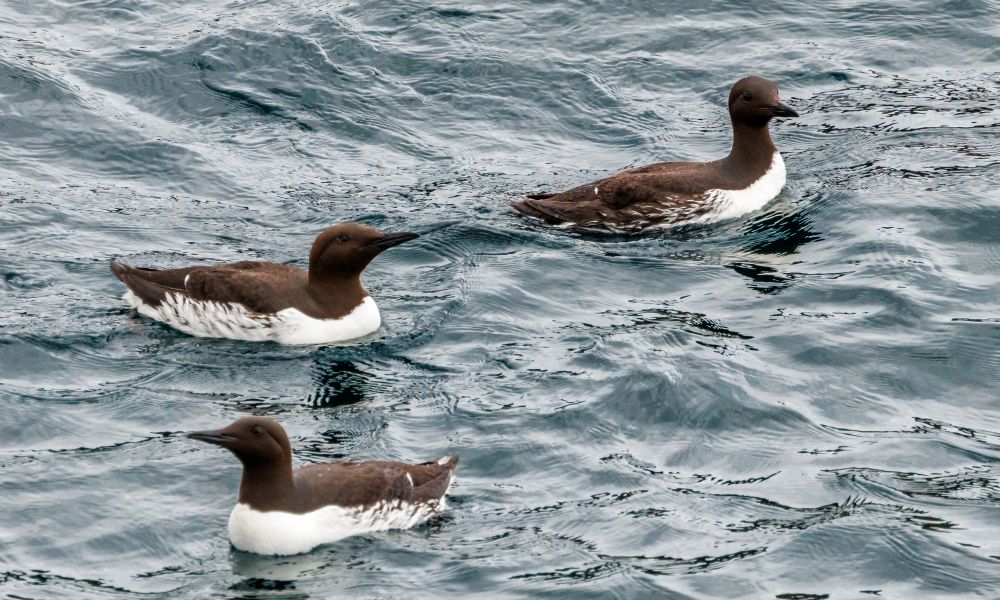 The Common Guillemot differs from the Brünnich’s Guillemot by having a longer, more pointed bill without the white stripe at the base of the upper mandible, as well as dark mottled markings along the flanks. In winter, its neck and sides of the head are white, featuring a dark stripe that extends from the eye across the ear-coverts. Juveniles closely resemble adult winter plumage but have shorter bills.