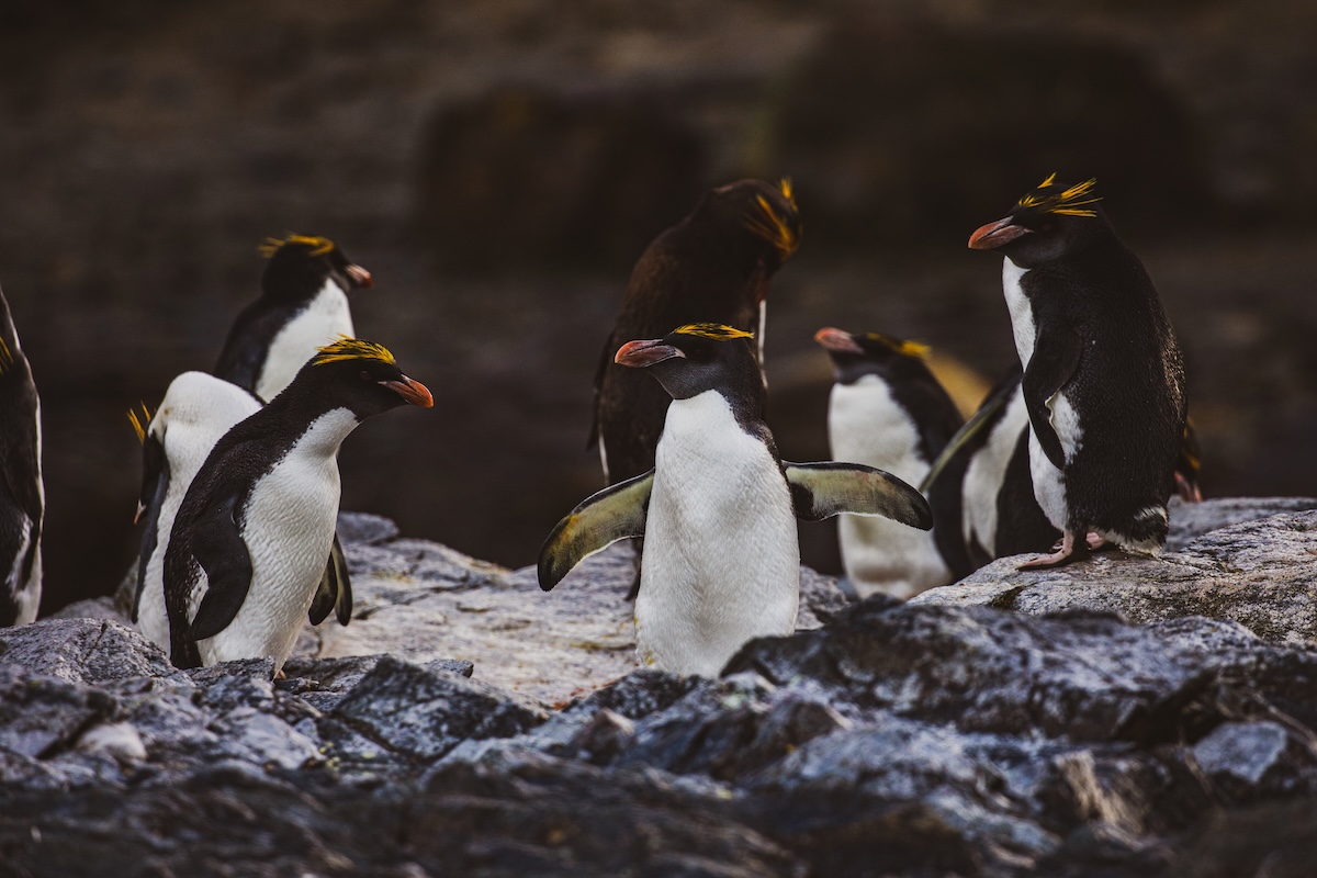 The macaroni penguin’s habitat includes rocky, coastal terrains on Sub-Antarctic islands such as South Georgia and the South Shetland Islands, as well as the Antarctic Peninsula, the Falkland Islands, and parts of southern Chile. Outside the breeding season, they can be found as far north as the coasts of South Africa.