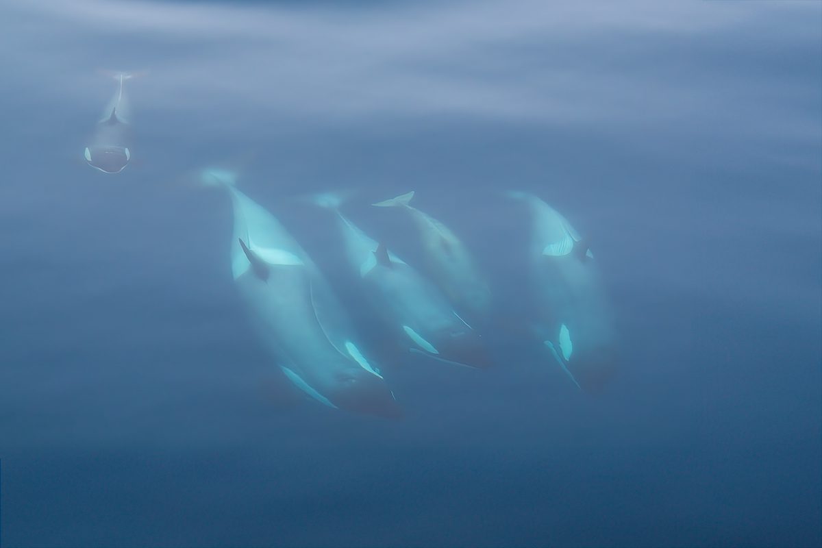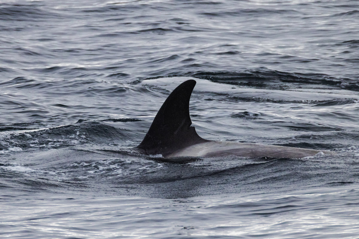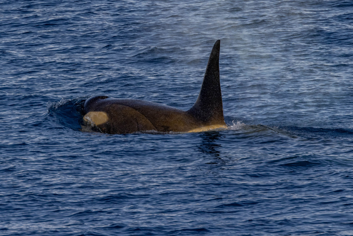 They are instantly recognisable by their sleek black bodies with large white spots around their eyes and on their bellies. The black-and-white colours help this baleen blend in both from above and below. The dark colour on the back matches the dark surface of the sea, while the bright underside is visible from below against the lighter sky and sunlight. They have a tall dorsal fin and are known for being more ‘stocky’ than other whales, which are quite long and sleek by comparison.