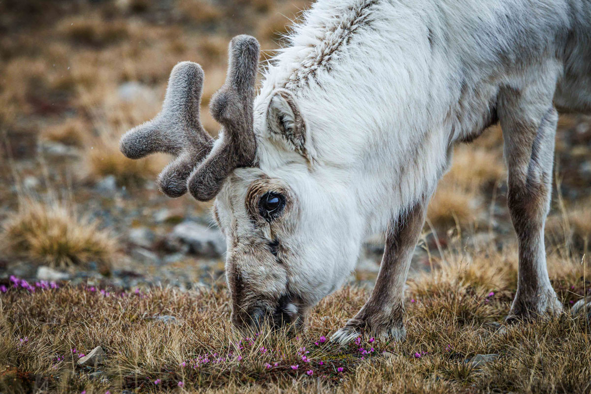 Yes, every reindeer species is herbivorous, feeding exclusively on plants. The Svalbard reindeer diet consists of grasses, mosses, lichens, small Arctic plants and flowers. During summer, they tend to eat as much as possible to store food in their bodies, since access to food is limited and of lower quality during winter, so they rely on their fat reserves.
