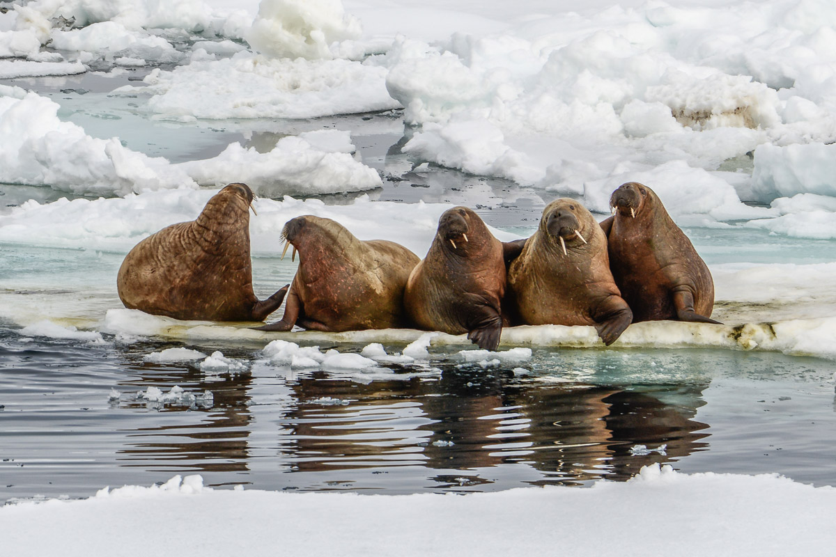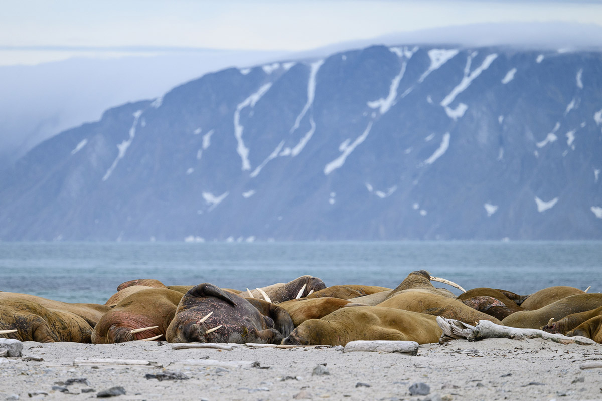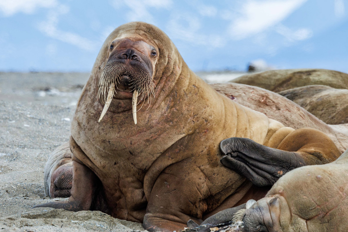 There are three different subspecies that can be spotted in the Arctic. The Pacific walrus (Odobenus rosmarus divergens) is the largest subspecies, and its name already suggests the region where they are found. The smallest subspecies are the Atlantic walrus (Odobenus rosmarus rosmarus) and the Laptev walrus (Odobenus rosmarus laptevi), which live in the Atlantic regions near Greenland and Svalbard. In addition to its greater size, the Pacific species features longer tusks, broader skulls, and a population eight times larger than the Atlantic species.