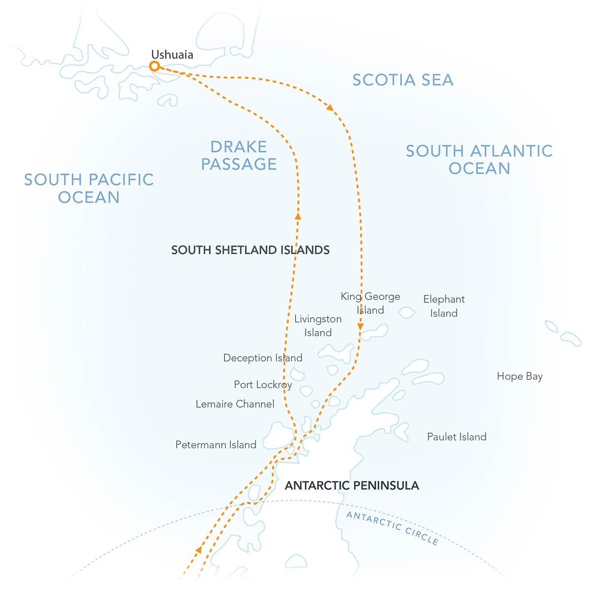 Venturing far south towards the Antarctic Circle is always one of our most popular voyages, so on this itinerary, we’ve added an extra day – more time to immerse yourself in this magical part of the world. On our journey south along the Antarctic Peninsula, you can expect to encounter some of Antarctica’s most engaging full-time residents – Humpback and Orca whales, seals, and, of course, a variety of those always-entertaining penguins. The farther south we go, a pristine environment becomes even more so, with the ultimate goal of reaching 66°33’S, and joining the small band of Antarctic explorers who can claim they have made it this far south.