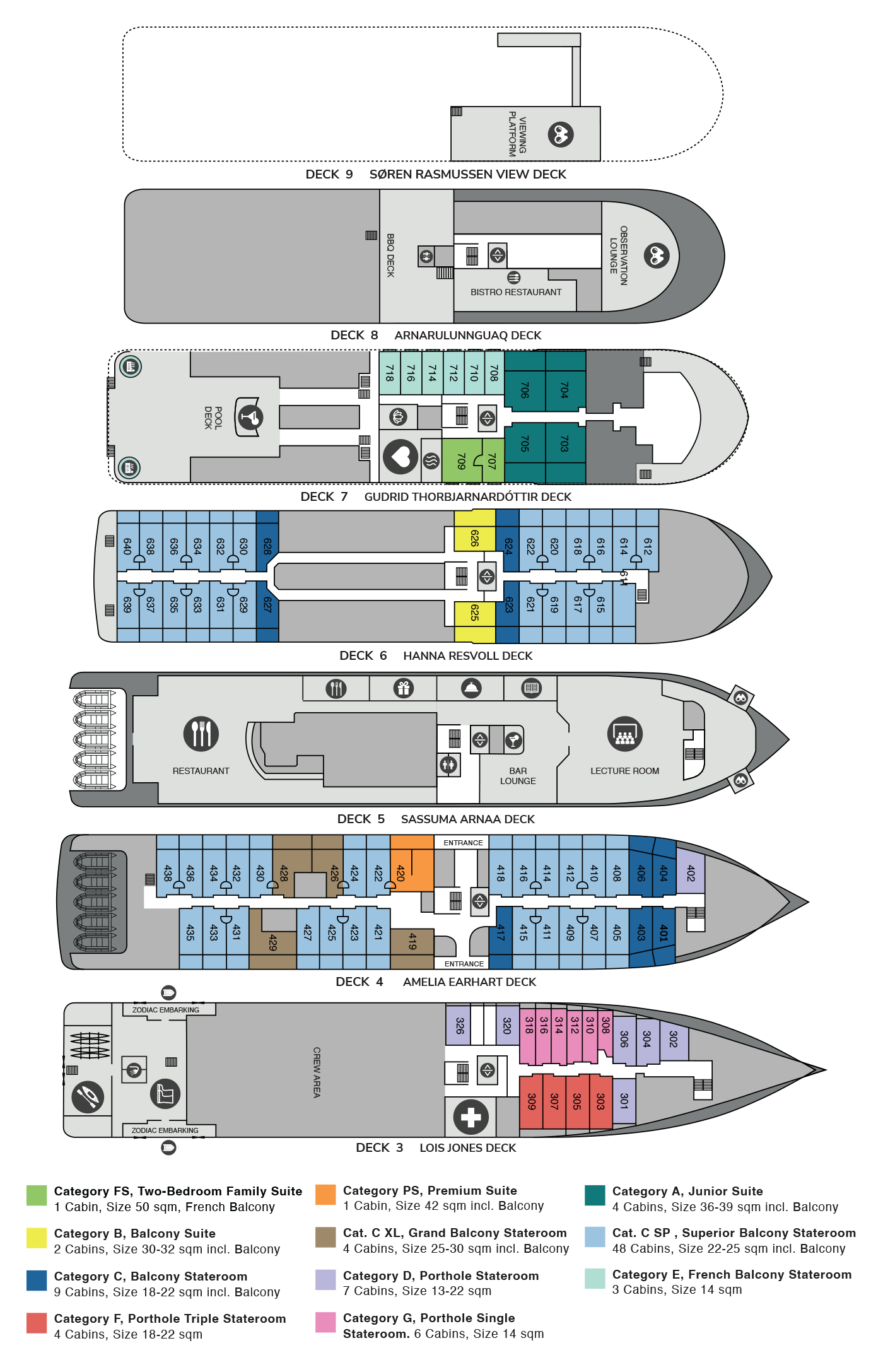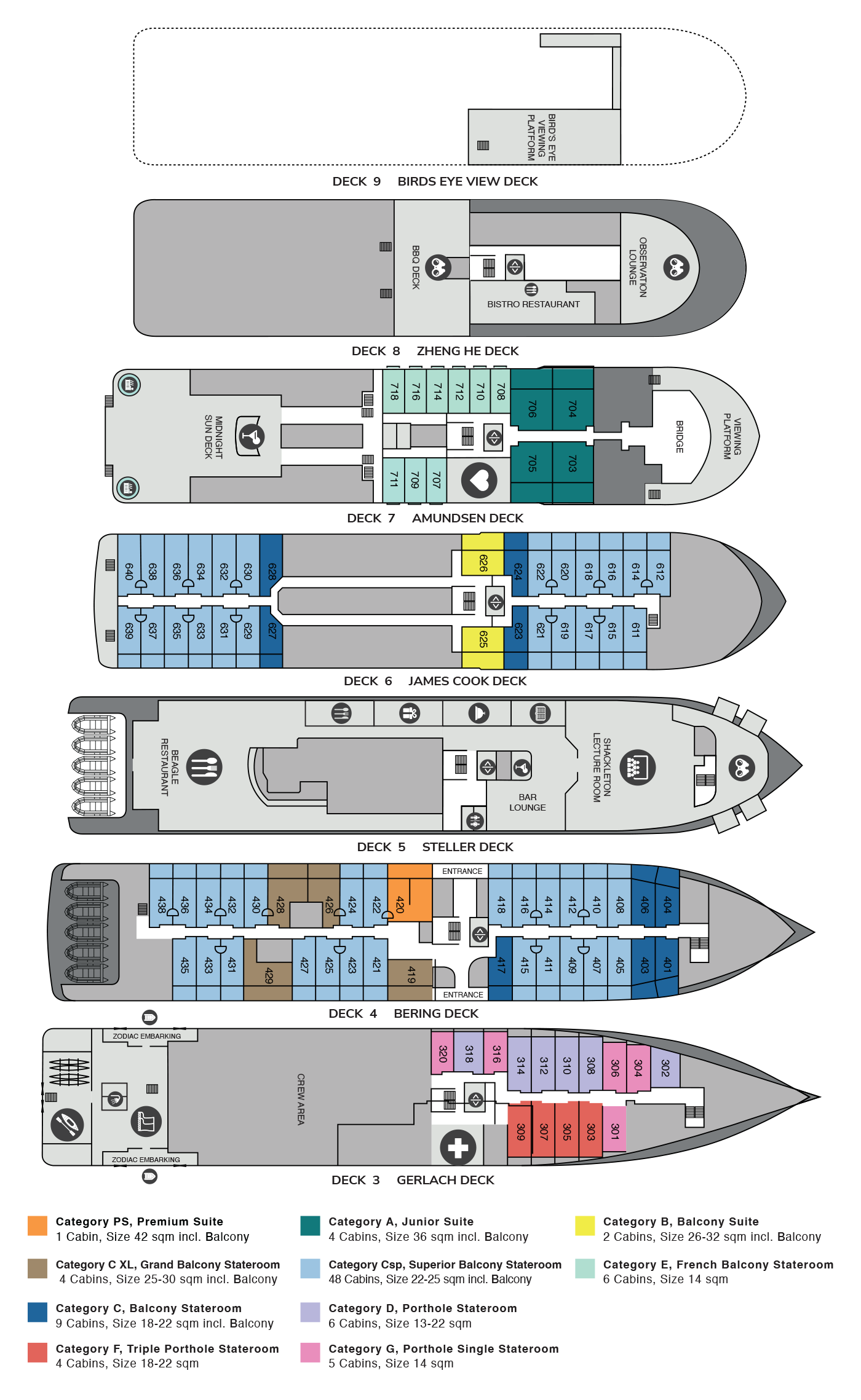 All staterooms offer several 230 W power and USB outlets, and ample luxury bathroom products, including a hairdryer. More details on the particular features of each ship and room inclusions can be found here. In the meantime, here’s a quick overview of our flagship, Ocean Albatros. Click the cabin type to see a representative drawing.